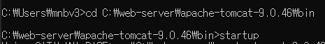 그 후 cmd에서 cd 톰캣폴더\bin 으로 이동 후 startup으로 실행