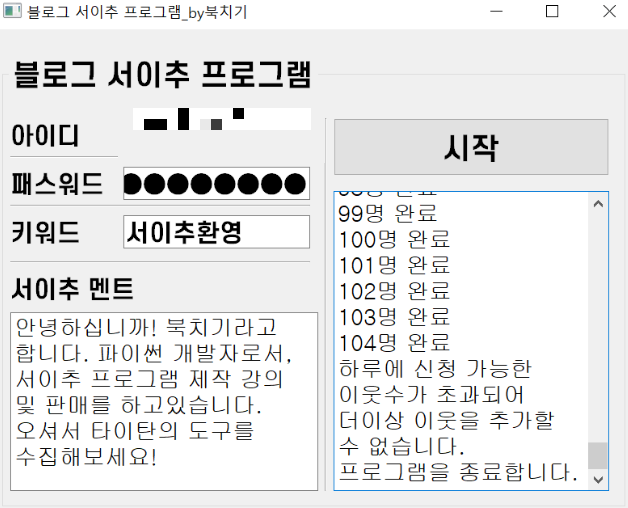 "안녕하십니까! 북치기라고 합니다. 파이썬 개발자로서 서이추 프로그램 제작 강의 및 판매를 하고 있습니다. 오셔서 타이탄의 도구를 수집해 보세요!"