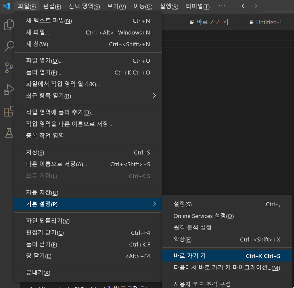 - 파일 - 기본설정 - 바로 가기 키 를 누른다.